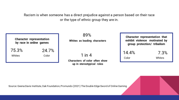 Racism is when someone has a direct prejudice against a person based on their race or the type of ethnic group they are in. Dominance of white supremacy and racial inequality is perpetuated in online video games. Nearly nine-in-ten (89%) leading characters are white and white characters outnumber characters of color three-to-one (75% compared with 24%) (Geena Davis Institute, 2021). This representation is less diverse than the US population, which consists of 40% people of color as of 2020 Census reports (Frey, 2021).