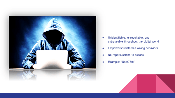 According to Suler (2004), “The vulnerability of these people is protected by anonymity and therefore may encourage negative actions, with users being able to disassociate their online persona from their offline personality and identity in order to avoid taking responsibility”. An example of this is instead of your real identity, one can have an ambiguous username like “User760x”, so others have no idea who you are, and you can get away with anything, including killing someone online.