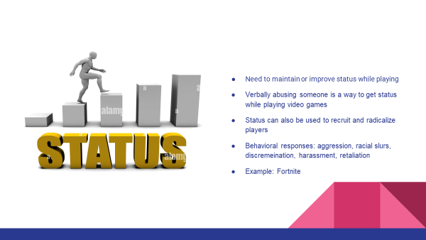 As gamers encounter other players that challenge their ability and gaming skills, they may lose their status. Some players go as far as throwing social norms out the window and bully other players or cheat to gain status. (Leaders, 2019). This fierce competition creates an environment that encourages bullying and harassment, with rank found to be the most common motive for cyberbullying (Ballard & Welch 2017). Status can also be used to recruit and radicalize players. Lack of status can force some behavioral responses like aggression, racial slurs, discrimination, harassment and even retaliation. Gamers who resort to cyberbullying engage in verbal, visual and relationship aggression such as name-calling, flaming, harassment, outing, embarrassing photos or memes and stalking (Ballard & Welch 2017). This need to achieve a higher status fuels the kinds of behaviors that can increase the likelihood of stereotyping and prejudice in online gaming.